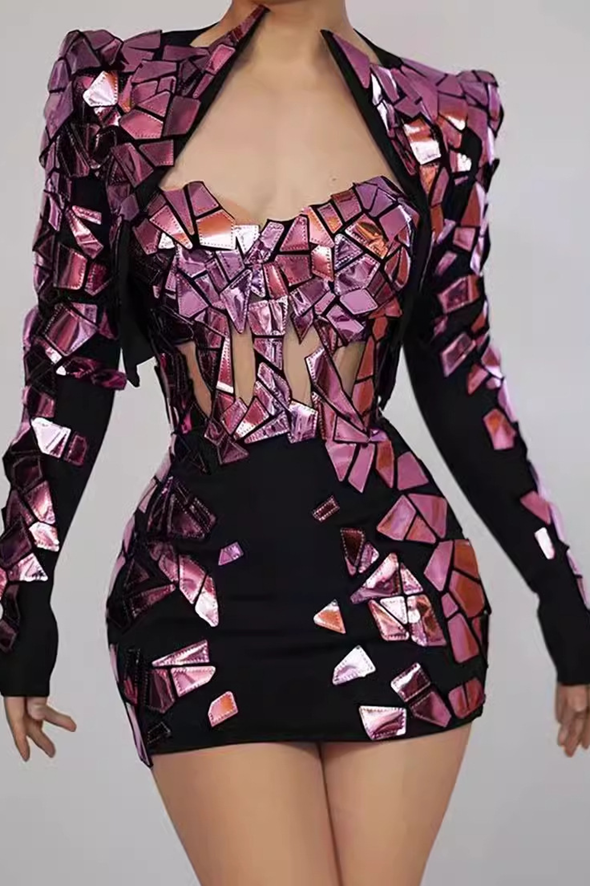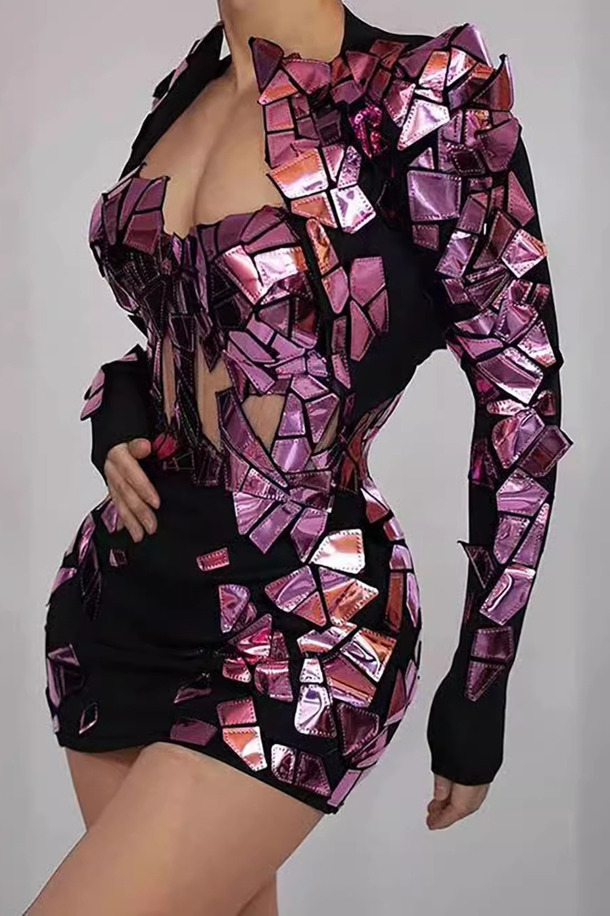Our 3-pc Cropped Jacket, Corset Top and Skirt Set with Gold Mirror Patchwork is a standout piece from Kevin, designed for women who appreciate modern luxury fashion.