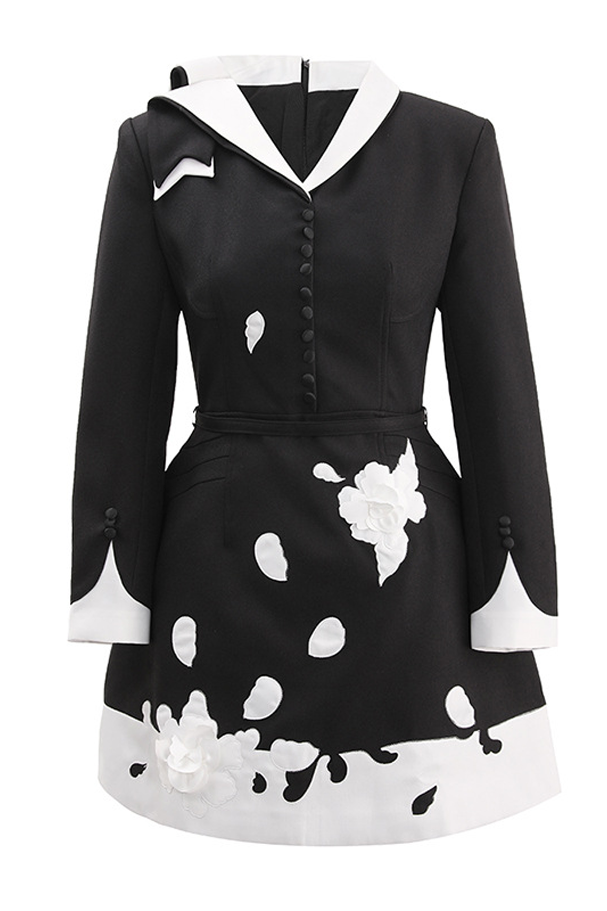 Black Floral Embellished Dress With Contrasting White Collar And Decorative Fabric Flowers