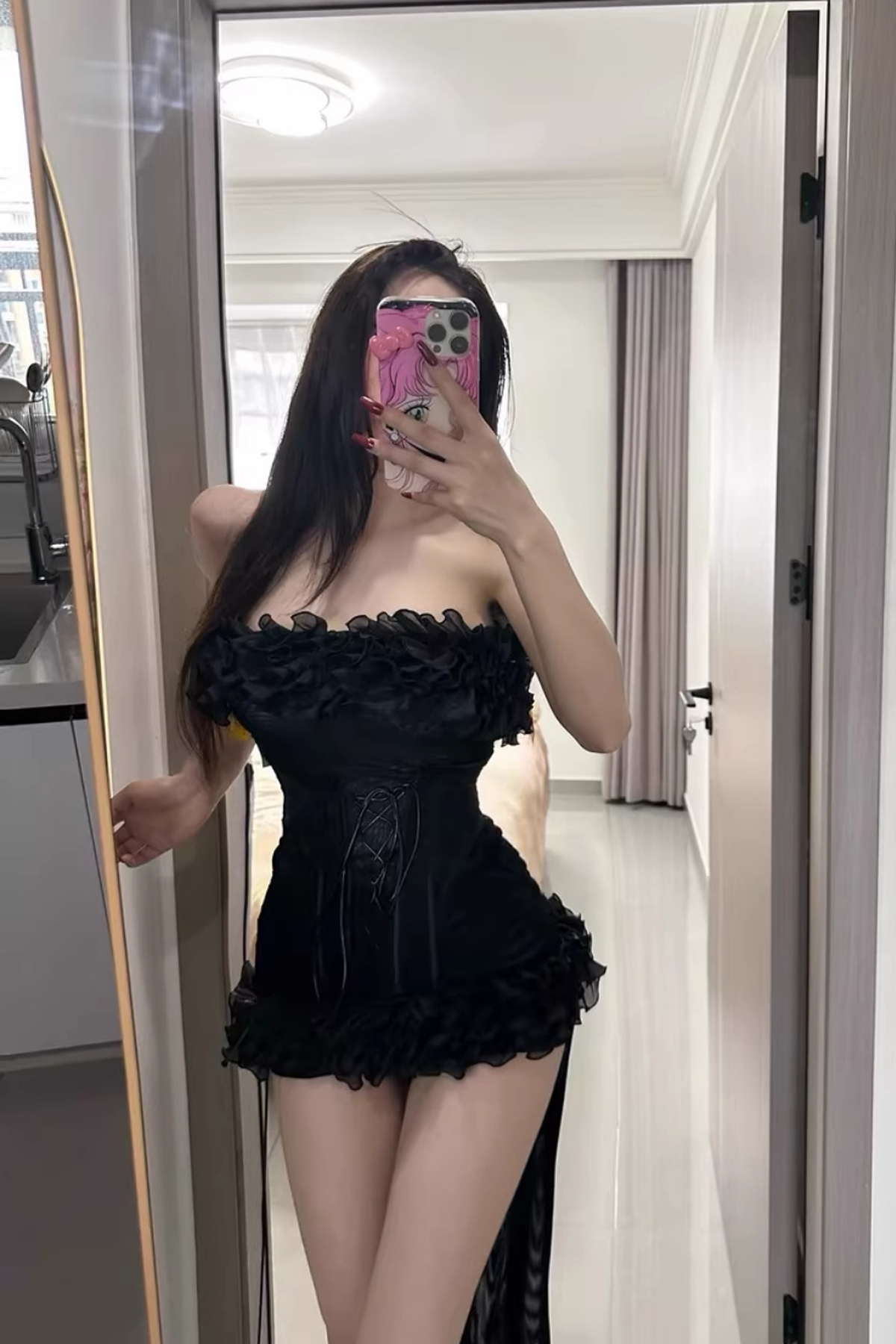 This black transparent evening dress features intricate detailing that enhances its elegant silhouette. Crafted with delicate sheer fabrics, it offers a sophisticated balance of allure and refinement, perfect for formal events. The carefully designed details ensure a flattering fit while maintaining a graceful flow, making it an impeccable choice for an expert-level wardrobe selection.