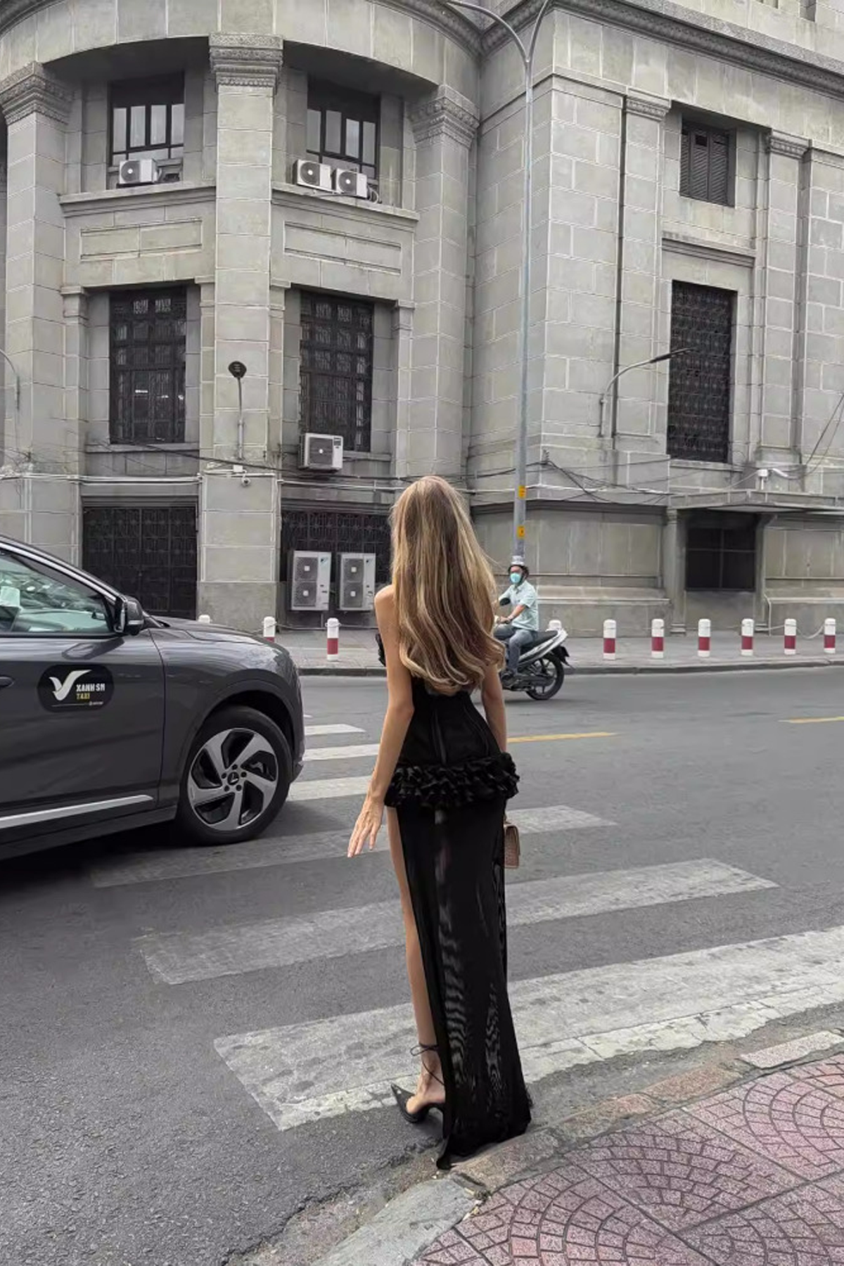 This black transparent evening dress features intricate detailing that enhances its elegant silhouette. Crafted with delicate sheer fabrics, it offers a sophisticated balance of allure and refinement, perfect for formal events. The carefully designed details ensure a flattering fit while maintaining a graceful flow, making it an impeccable choice for an expert-level wardrobe selection.