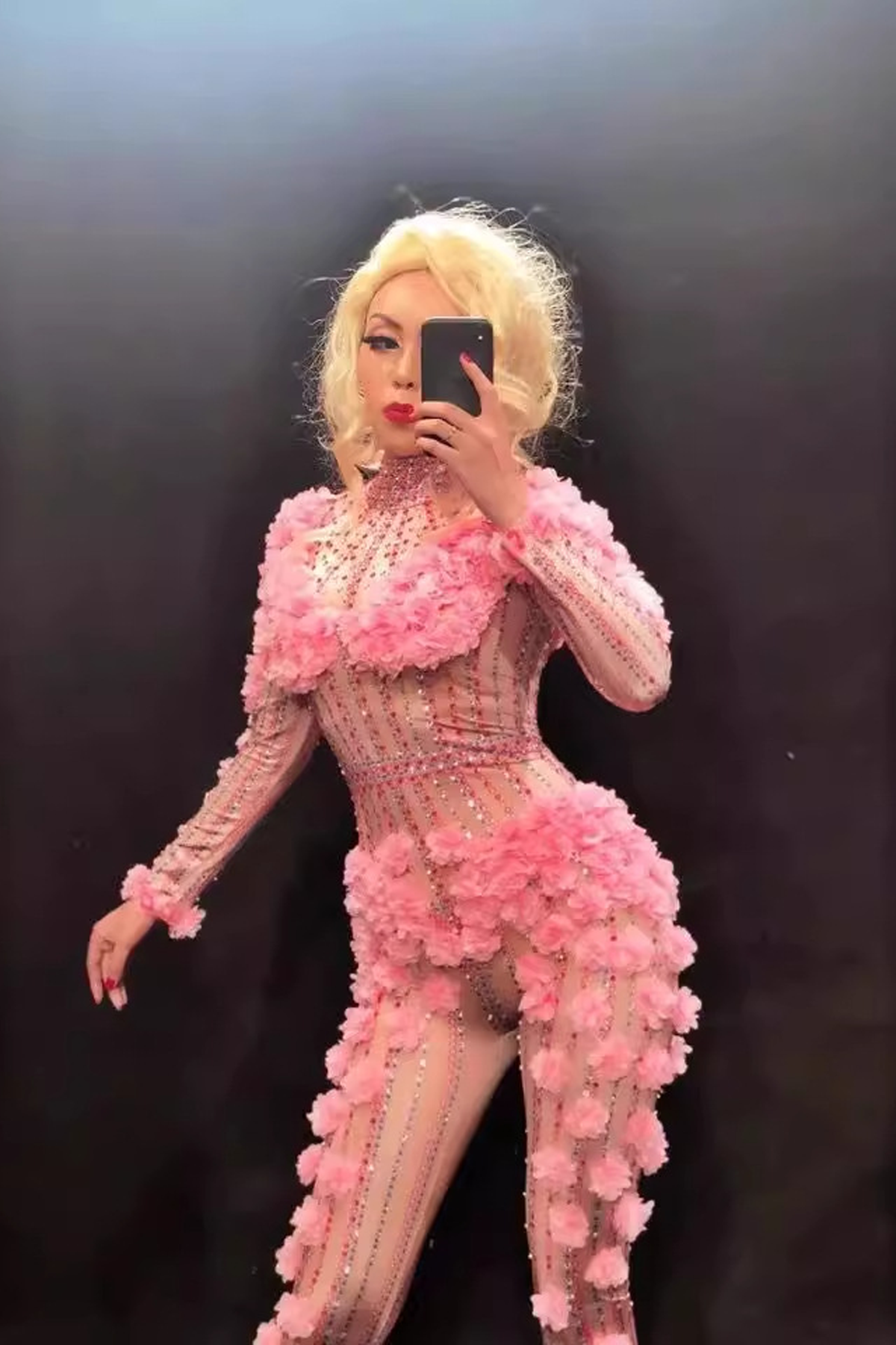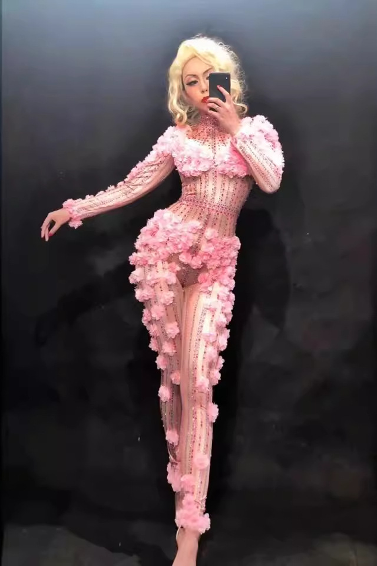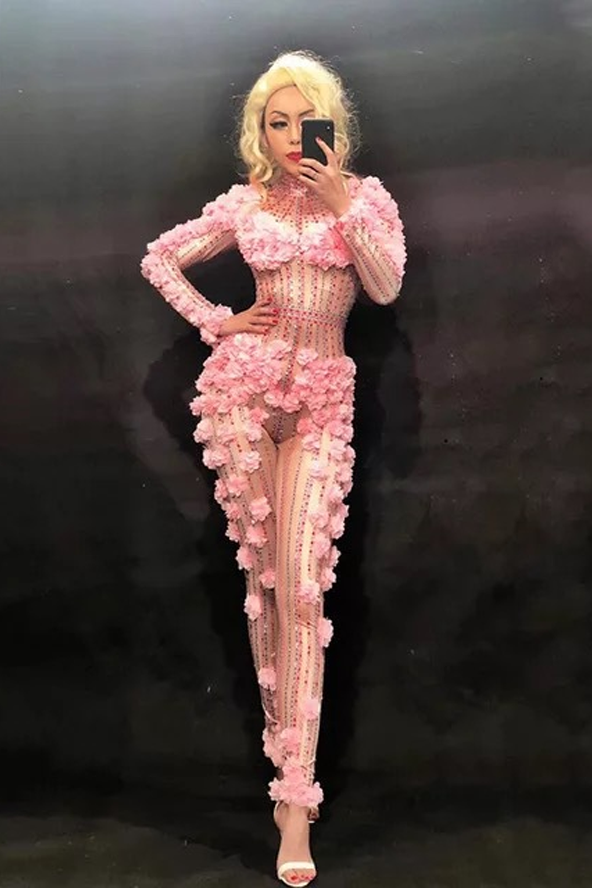 Bloom with boldness in the Blush Garden jumpsuit — a romantic showpiece that blends sensuality with springtime fantasy. This nude mesh, figure-hugging design is covered in shimmering rhinestone lines and adorned with delicate 3D pink floral appliqués. From the neckline to the ankles, every detail is crafted to highlight your silhouette and leave a trail of enchantment behind.