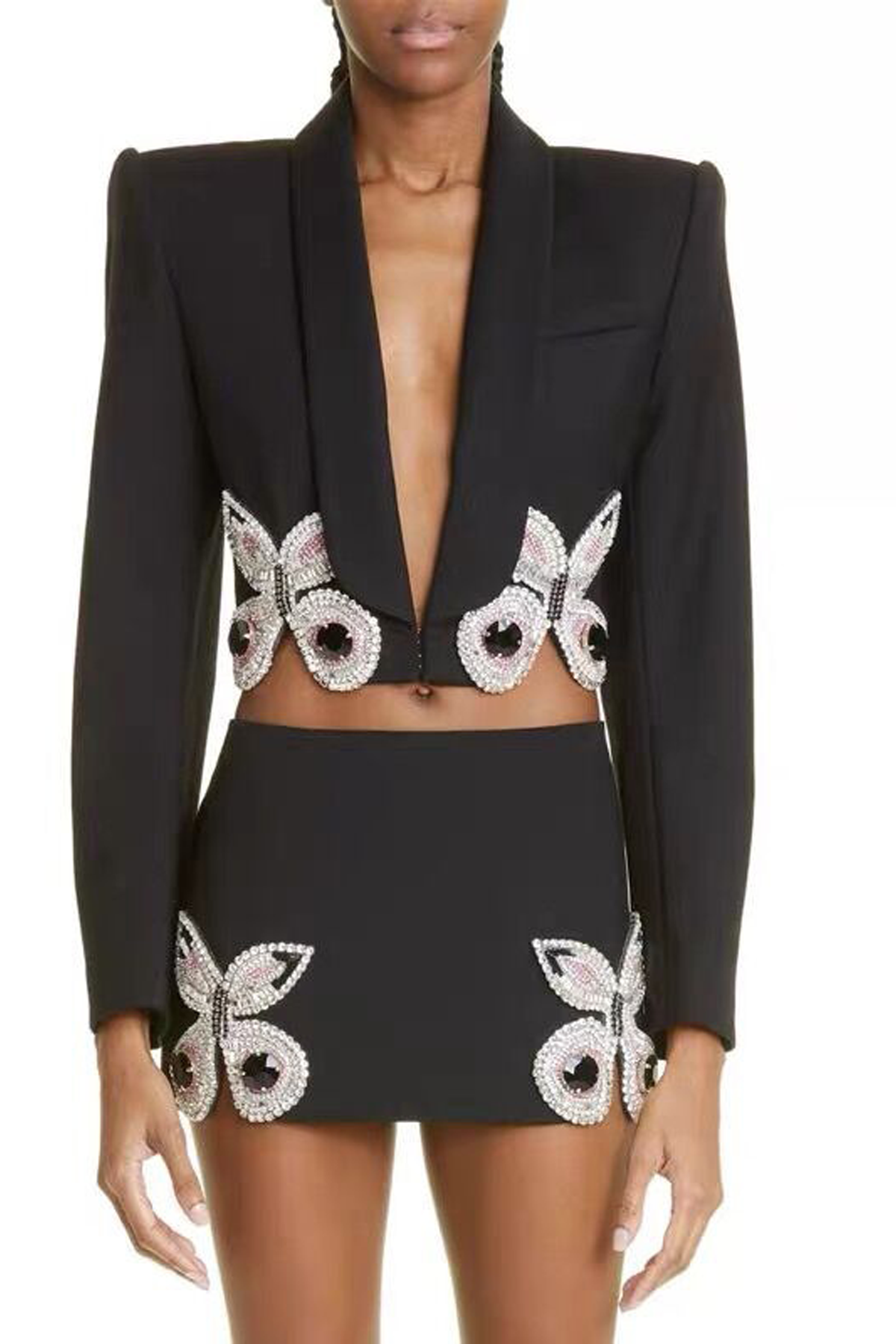 Introducing the Butterfly Crystal Embellished Blazer! Stand out from the crowd with its shimmering crystal butterfly motif. Made with comfortable lightweight fabric, this blazer exudes confident, timeless style. Make any look shine!