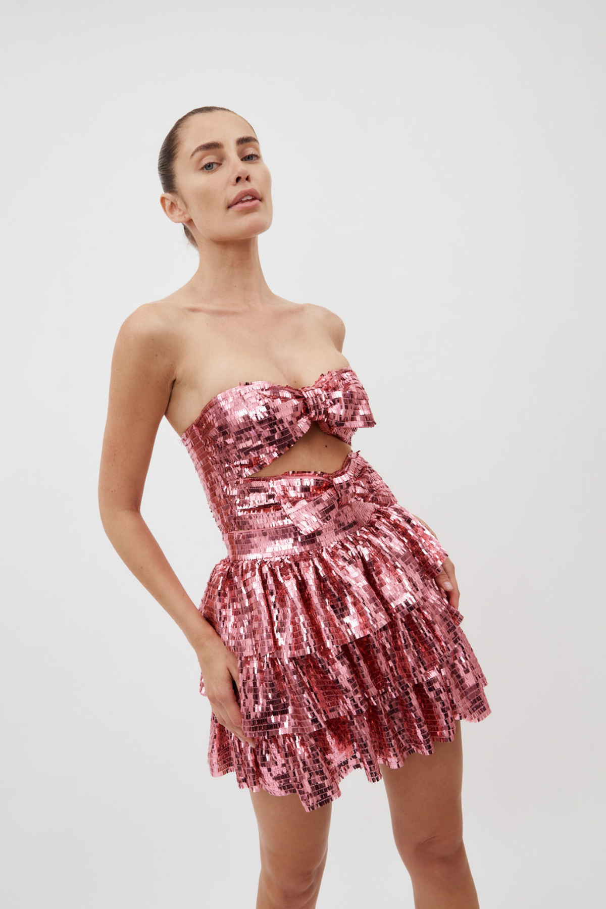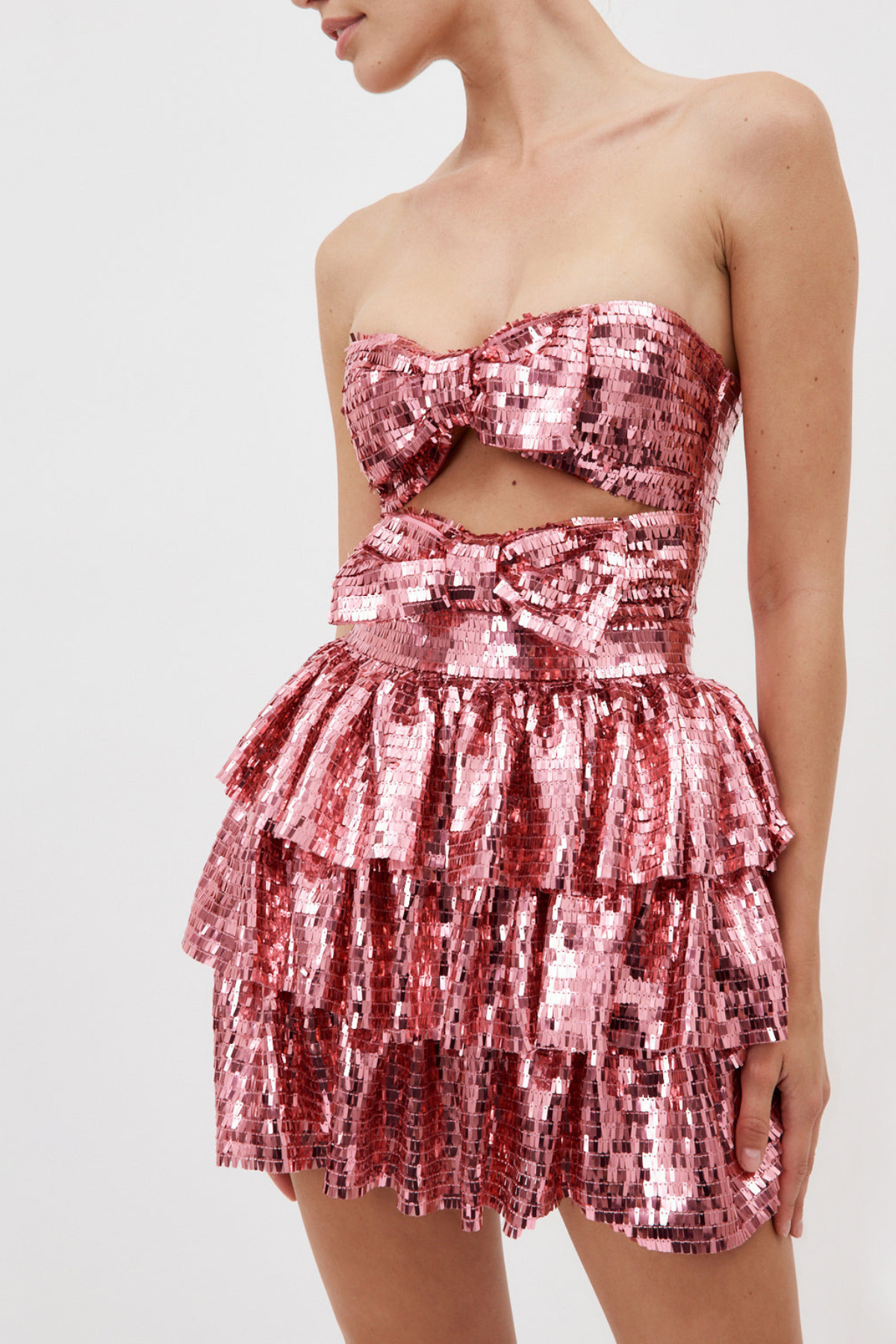 Step into the spotlight with the Disco Queen Sequin Bow Cutout Mini Dress, designed to make you the center of attention at any event. This eye-catching mini dress features a unique cutout design adorned with a sparkling sequin bow, adding a touch of glamour and fun to your ensemble.