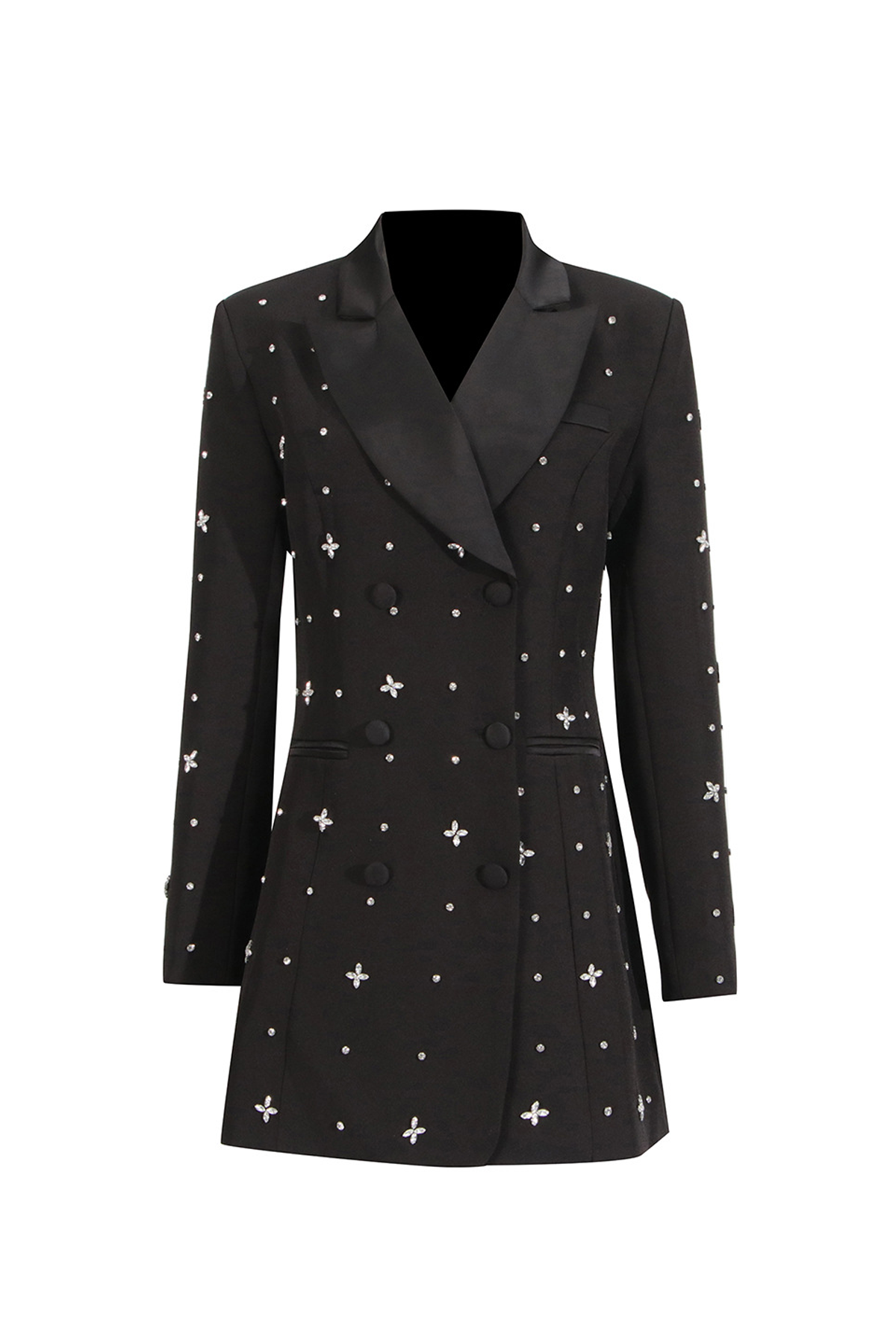 The woven blazer dress features crystal embellishments, a satin collar, and peak lapels. The design incorporates a chest pocket and front slip pockets. It is fully lined with double-breasted button fastenings through the front. The composition is 39% wool, 31% polyester, 25% viscose, and 5% elastane. The mid-weight blazer dress has a slim fit and a length of 33 inches/ 84cm from shoulder to hem.