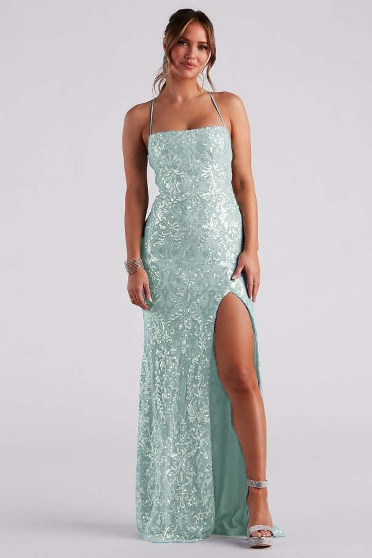 Special Occasion Gorgeous and glam, the formal sequin mermaid dress will give off major regal energy. She features a sleeveless square neckline, spaghetti straps that lead to a cross-back lace-up design, a floor-length skirt with a mermaid silhouette, and a high side slit to showcase some leg. The lined mesh fabric features all-over sequin embroidery in a luxe scroll pattern. Complete your formal affair look with gold hoops and neutral heels. Fit & Features Sleeveless square neckline, spaghetti straps Adhesive bra recommended Open back, cross-back lace-up strappy design, tie closure High waist seam, lower back zipper, hook and eye closure Floor-length, fitted, mermaid silhouette, high side slit Sheer mesh fabric, full knit lining, moderate stretch Sequin embroidery, scroll pattern Runs true to size