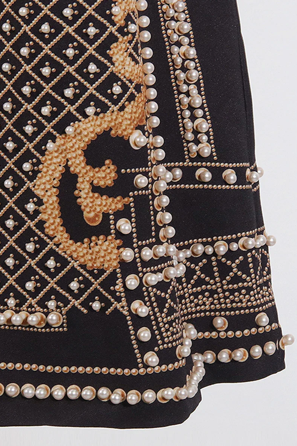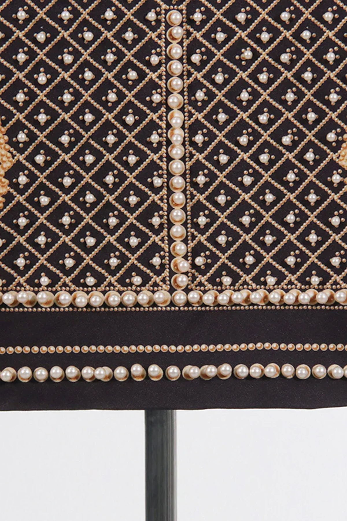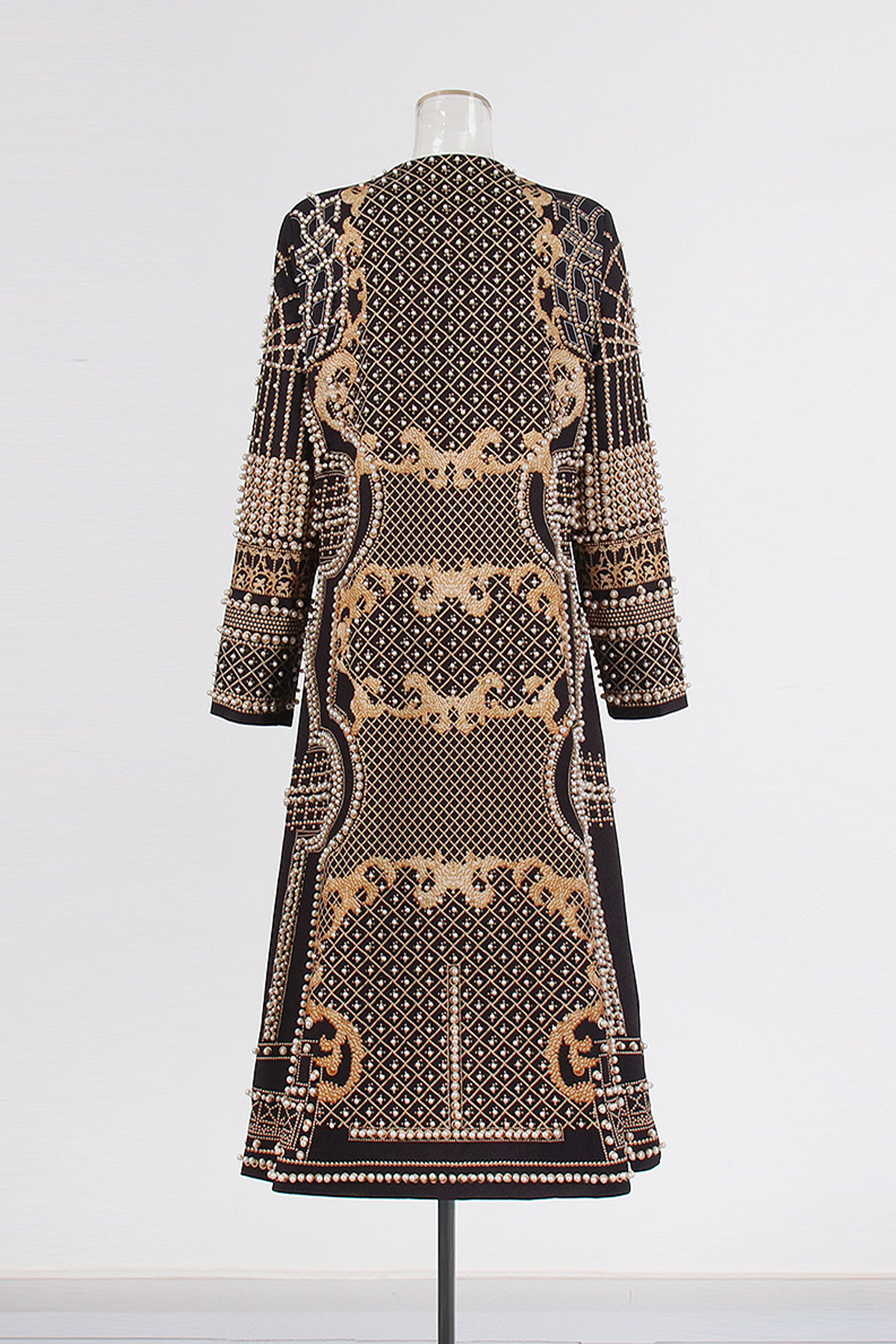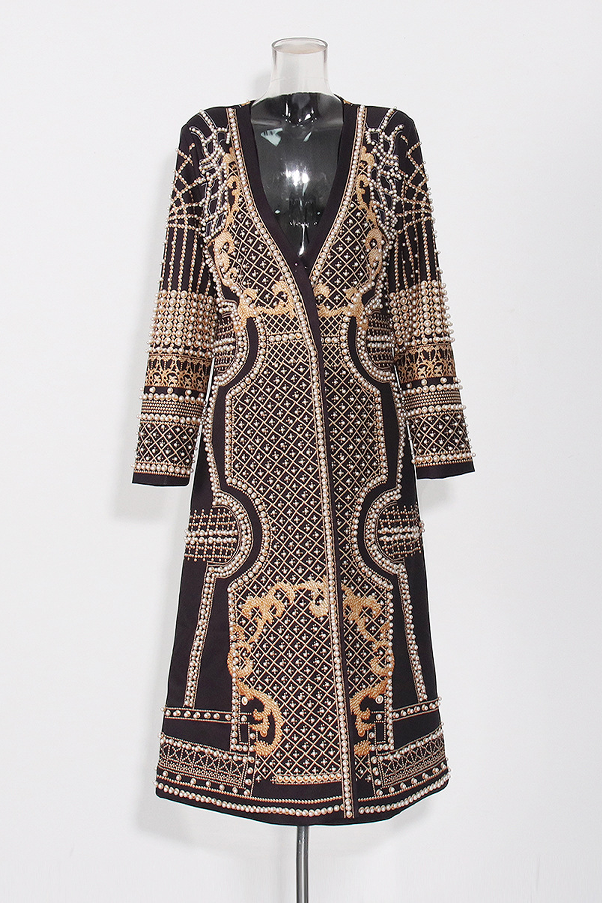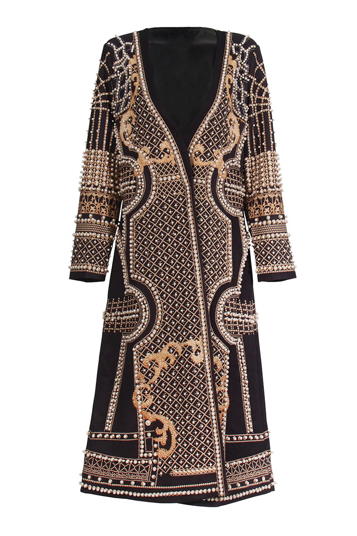 This luxurious long coat is a true work of art, featuring hand-embroidered pearls and intricate detailing.