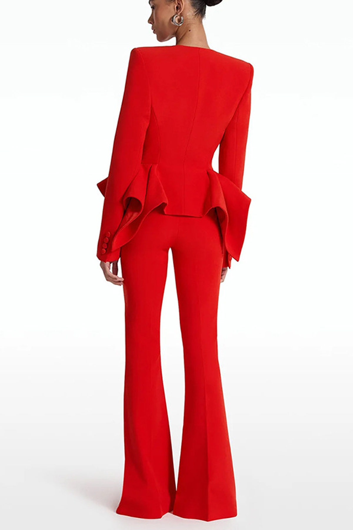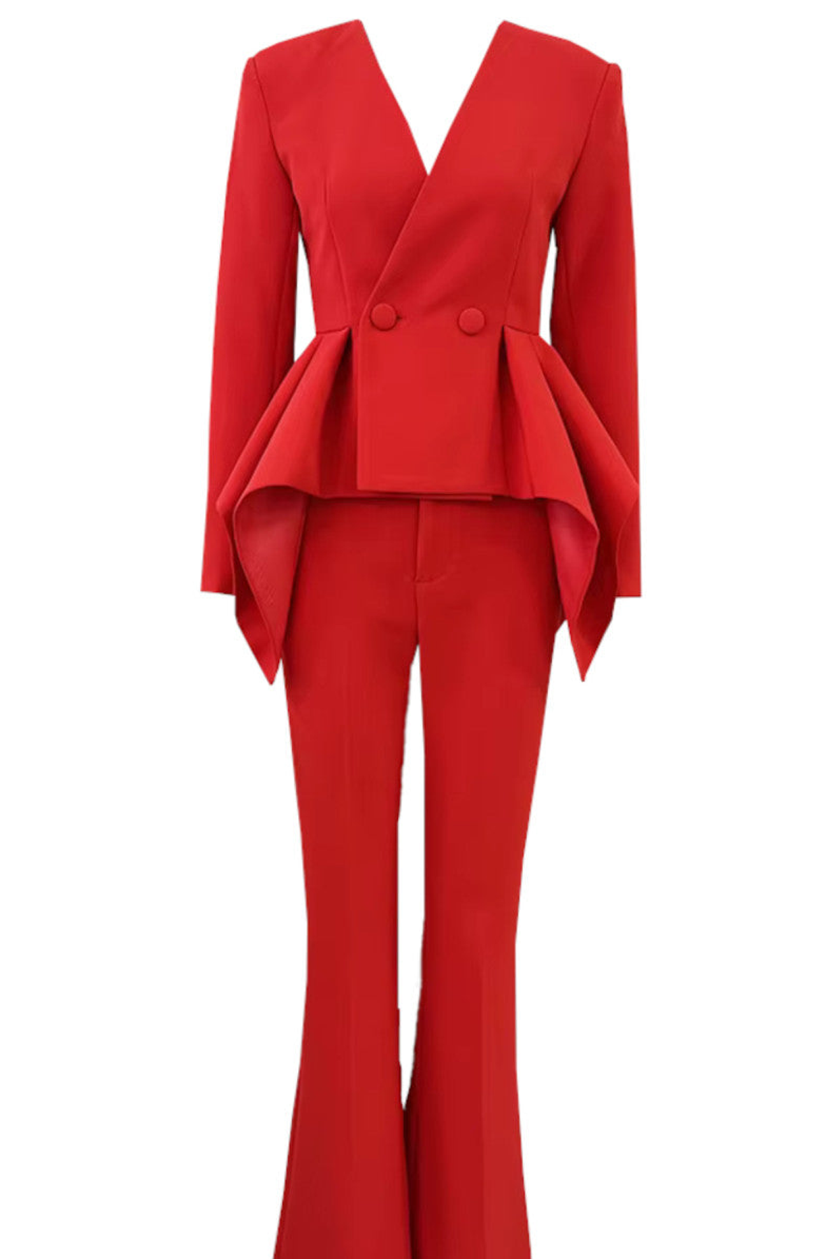Command the room with the Long Sleeve Peplum Detail Suit—a bold fusion of sharp tailoring and feminine flair. Designed for the modern power dresser, this suit features a structured blazer with a cinched waist and sculpted peplum detail that accentuates the silhouette with elegance and strength. Paired with sleek, tapered trousers, the look is both polished and fashion-forward—perfect for work-to-event transitions or statement-making moments.