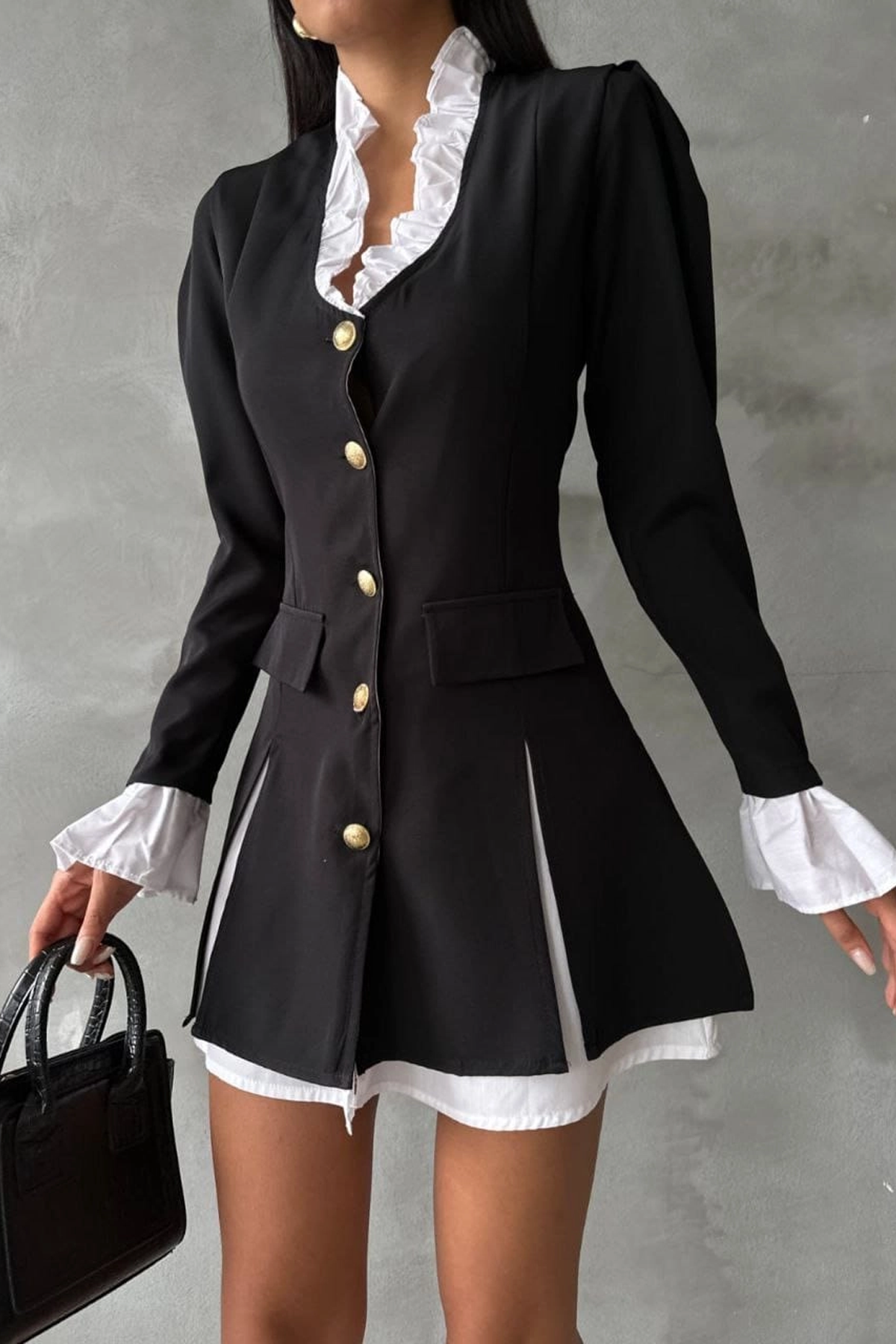 Ruffle Neck, Pocket Detail, Long Sleeve, Shirt Short Dress, Mini Length.