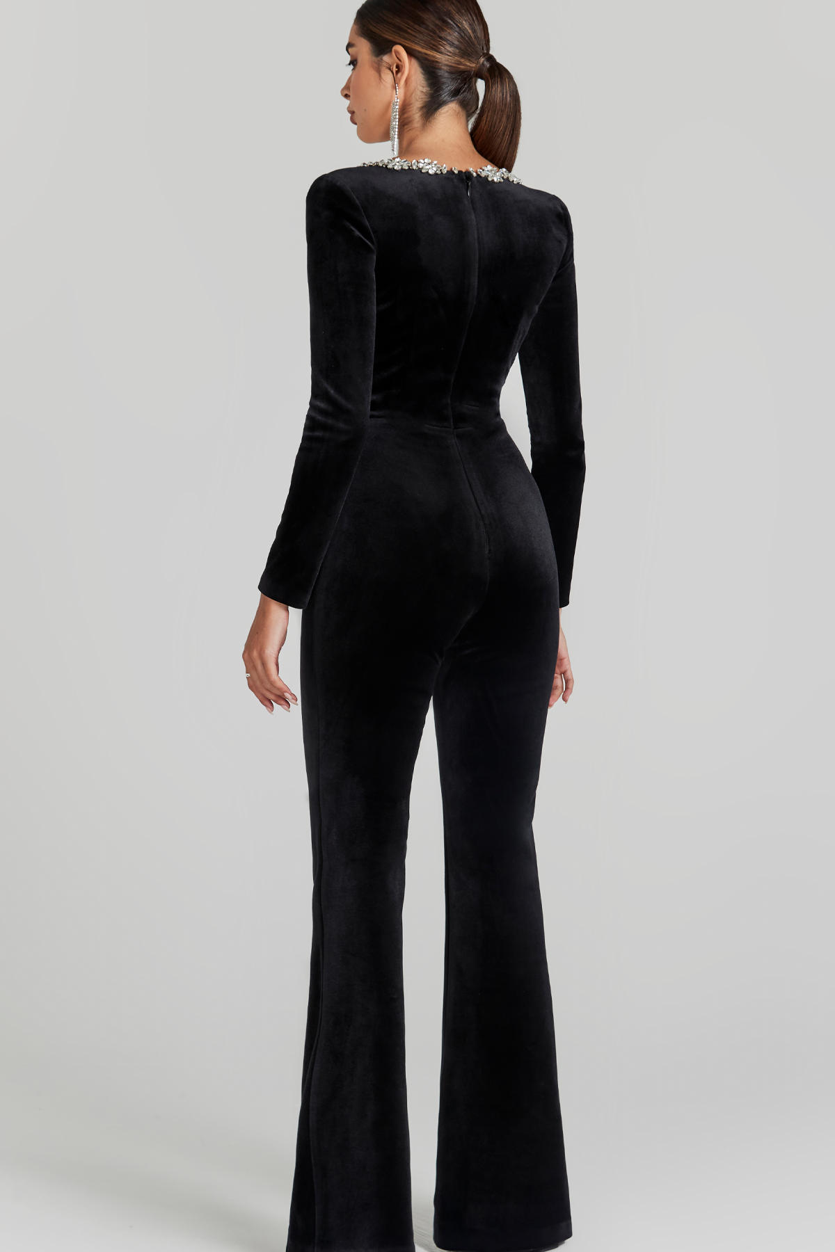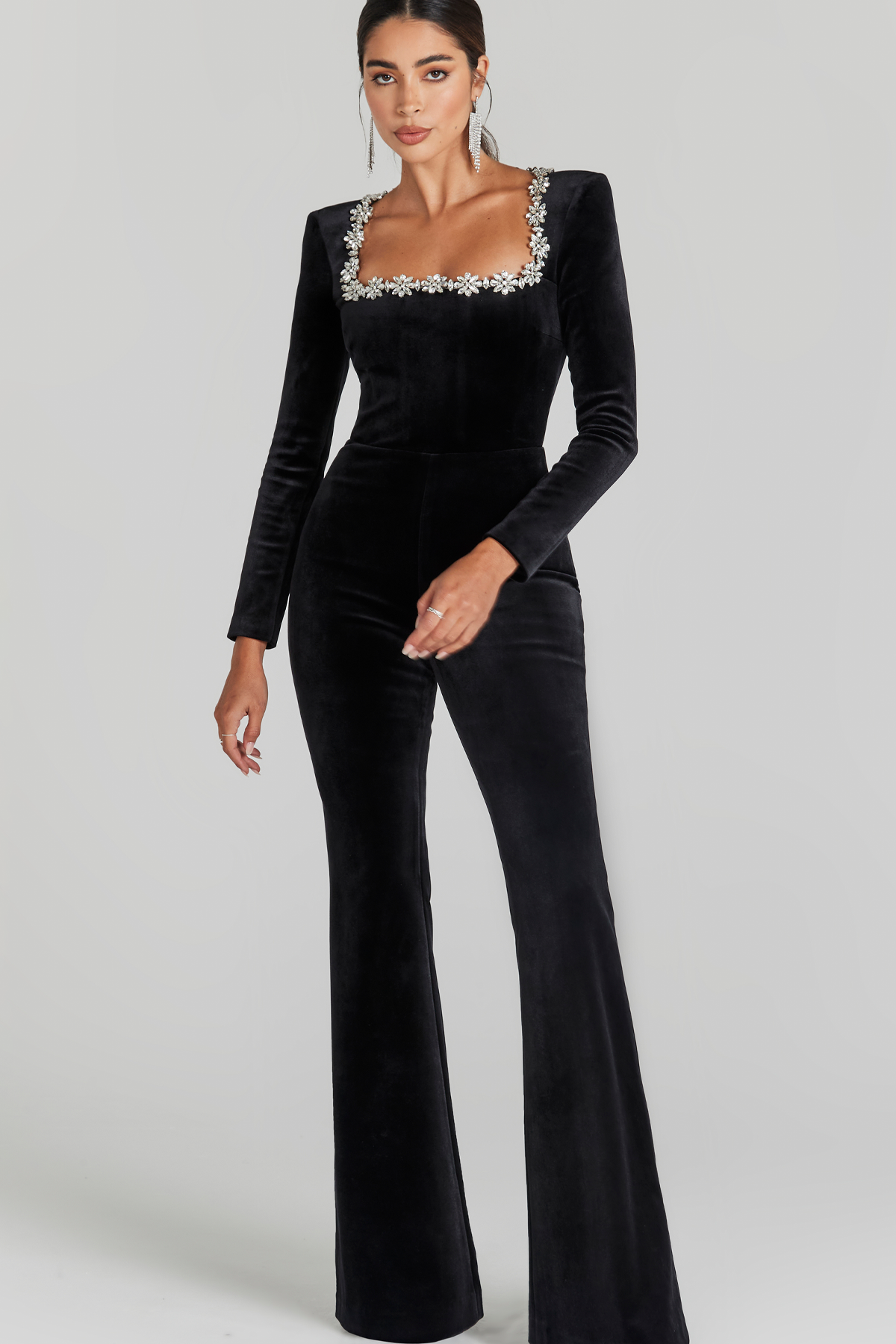 The LUCY Black Jumpsuit is designed for unforgettable entrances and endless celebrations. This black velvet embellished jumpsuit features a square neckline, shoulder pads, and internal corset boning to sculpt the bodice and flatter the shape. The luxurious black velvet material and jewel-embellished trim add a touch of opulence, while the flared trousers and concealed zip create a sleek finish.