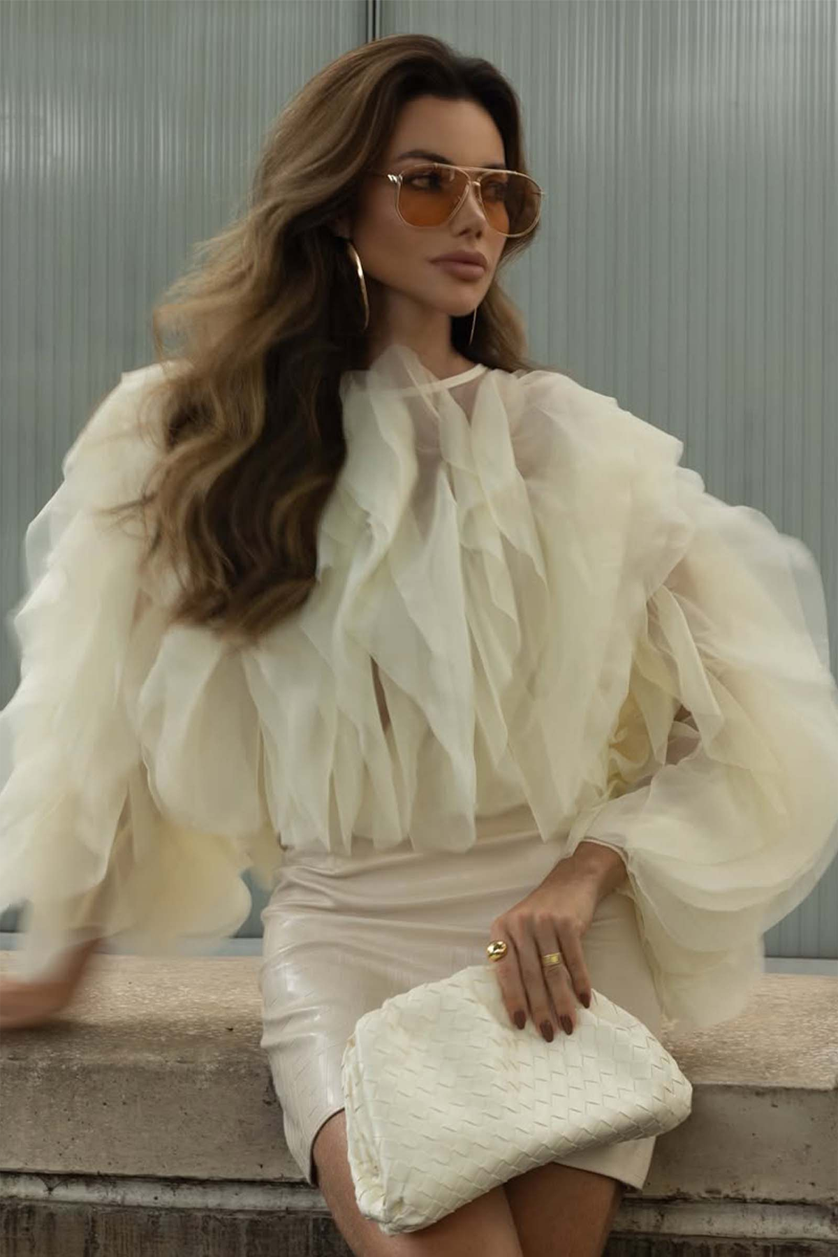 Introducing the Mesh Ruffle Ruch Shirt, in a gorgeous apricot color. This versatile shirt features delicate mesh detailing, ruffle accents, and a flattering ruched design. Perfect for elevating any outfit, while providing comfort and style. Try it out and see the difference for yourself.