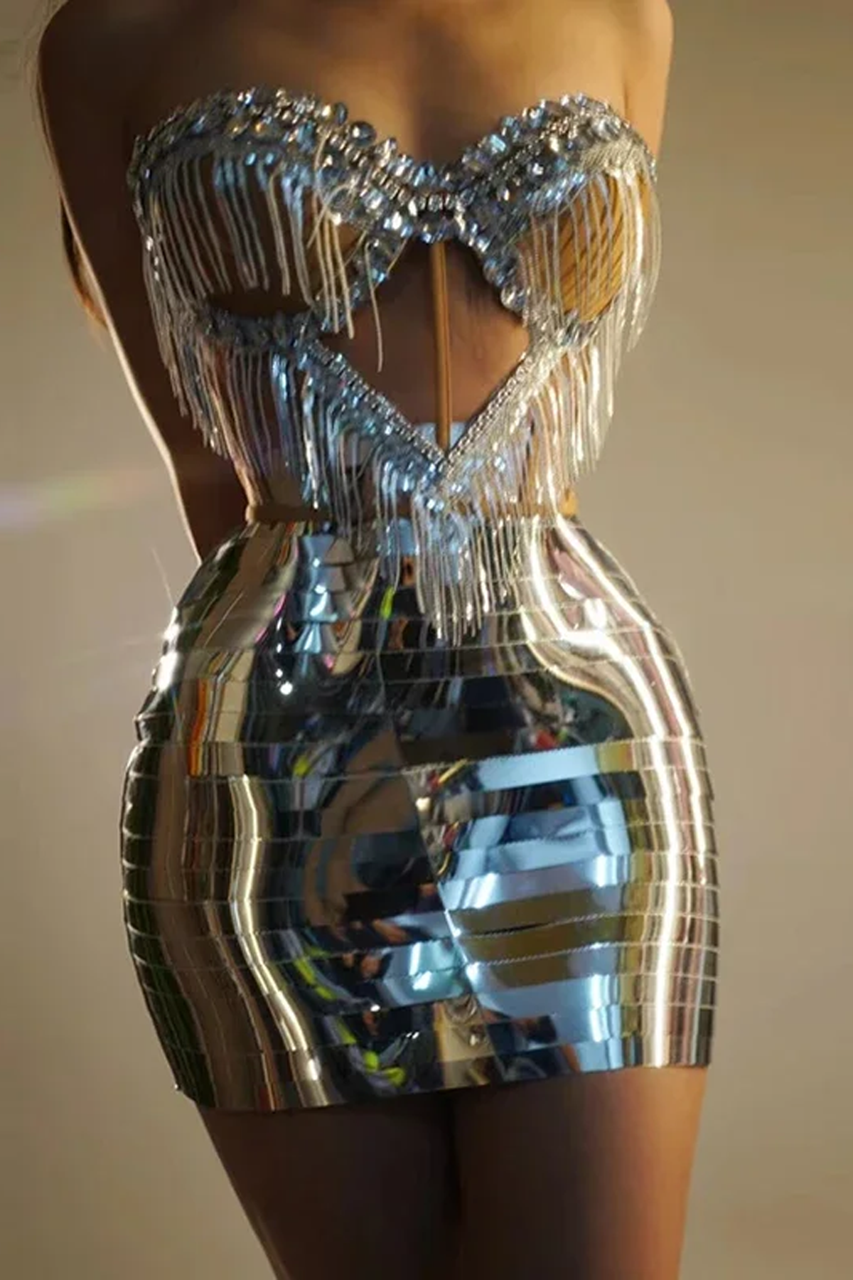 Sparkle and shine in the Rhinestone Fringe Metallic Mini Dress! This stunning dress features a shimmering rhinestone and fringe design, perfect for turning heads and making a statement. With its eye-catching details, this dress will make you feel confident and glamorous for any special occasion.