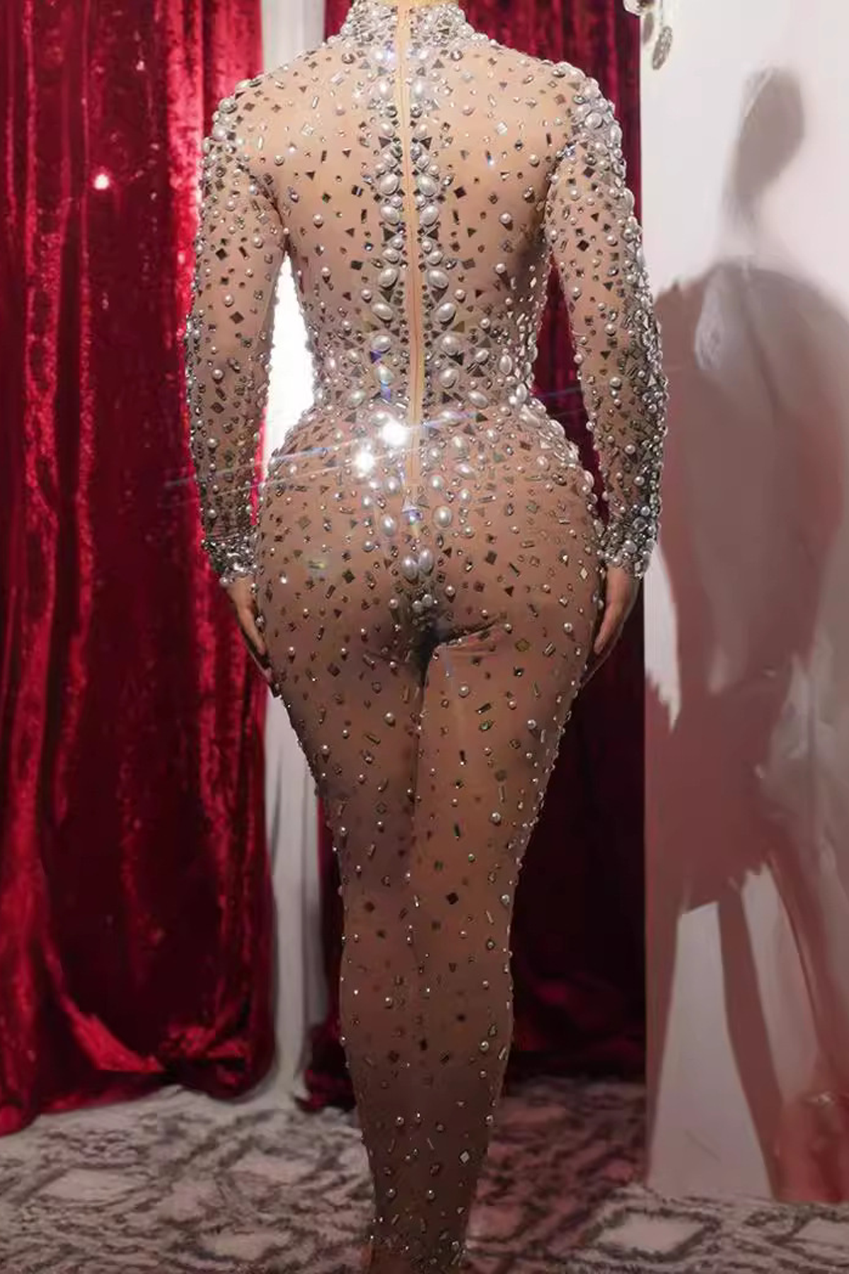 This jumpsuit is a stunner. Adorned with rhinestones and pearls, it's perfect for performance events. Whether at a club party or a bar gathering, it makes you stand out. Its stylish design ensures you'll be the spotlight of any occasion.