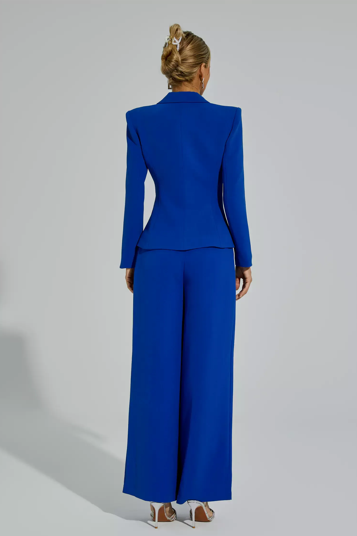 This chic wrap jumpsuit features a stylish long-sleeve design and a flattering belted waist that accentuates the silhouette. The vibrant blue color adds a bold, modern touch, making it perfect for both professional and evening events. The tailored fit, combined with the sleek wrap detail, offers an effortlessly sophisticated look. Ideal for those seeking a statement piece that exudes elegance and confidence.