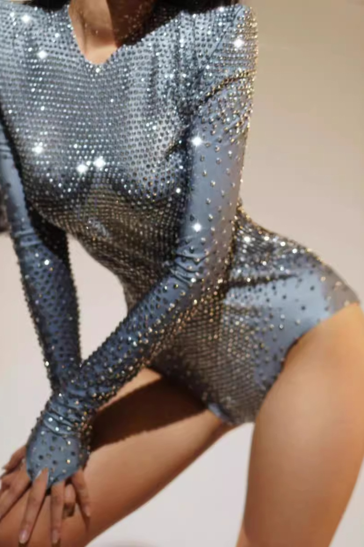 A sculptural stage-ready bodysuit engineered with precision placement of faceted rhinestones over a power-stretch mesh base. Designed for maximum sparkle under lights, this look features sharply padded shoulders, a high neckline, and a second-skin silhouette that hugs the body from wrist to hip. The sleeve and hip panels are elongated for a fluid, dramatic finish. Invisible zip back closure. Style with fishnets, boots, or layered under oversized outerwear for editorial moments.