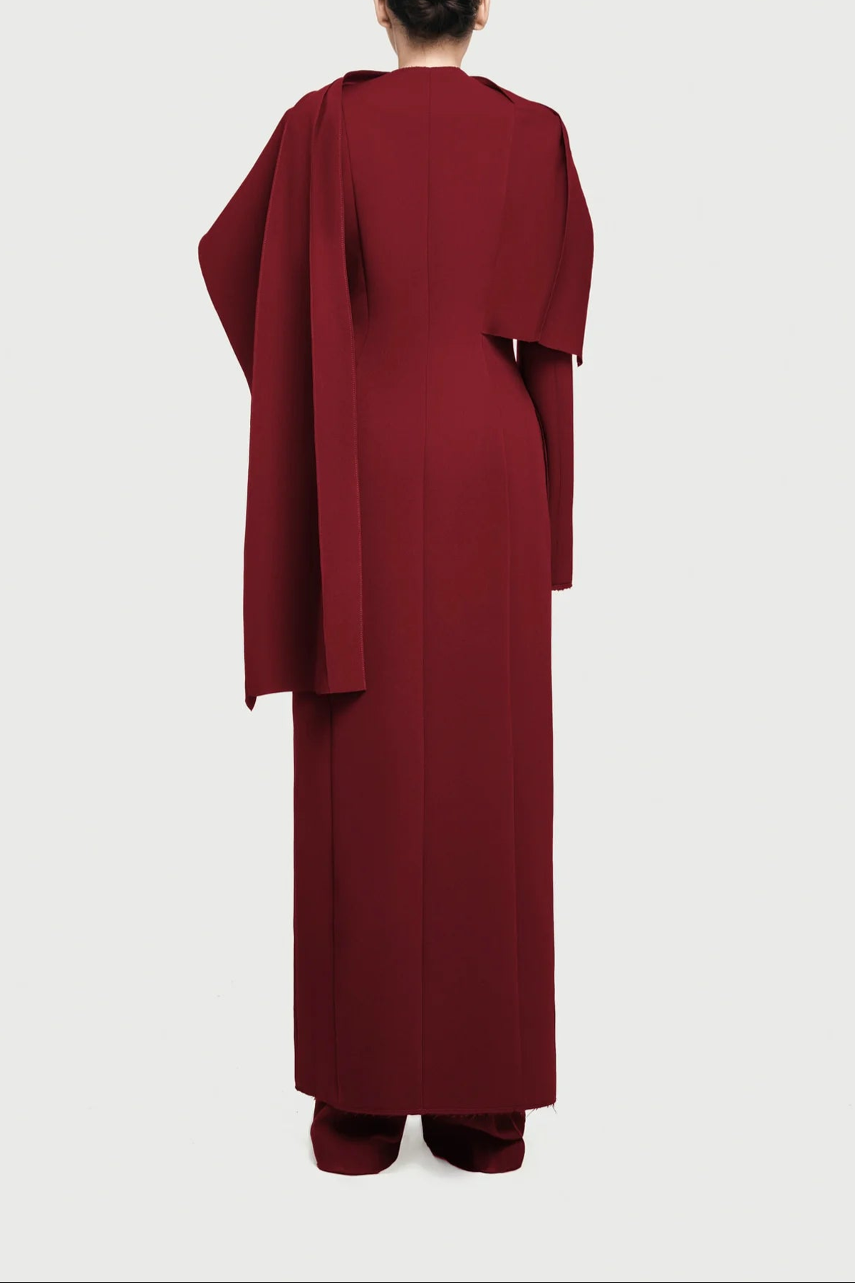 Twill Suiting cape with asymmetrical shoulder pleat and metalic button detail