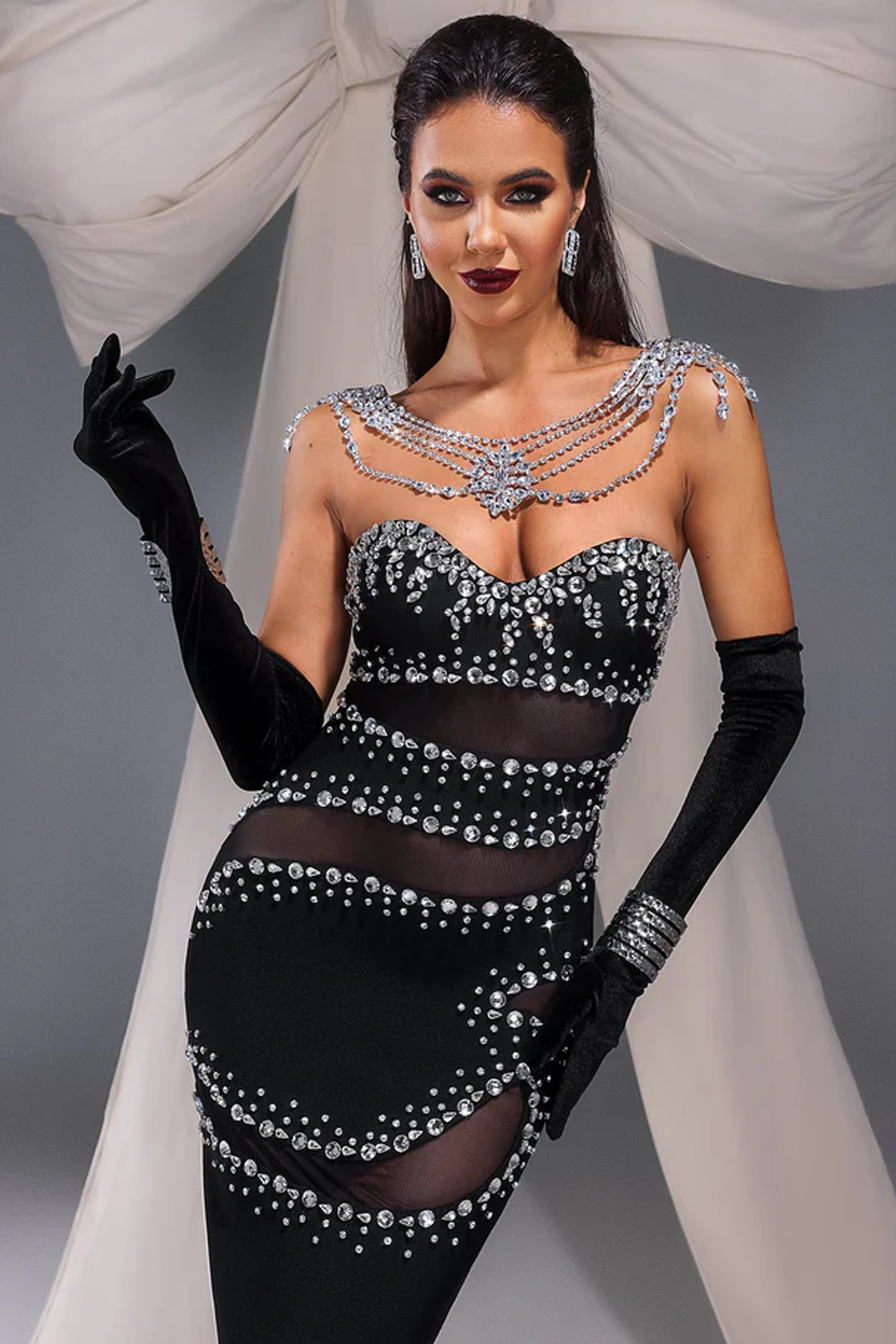 Unleash your daring dreams with Siela! This velour dress is adorned with see-through mesh panels and sparkling stones, while also including matching gloves.