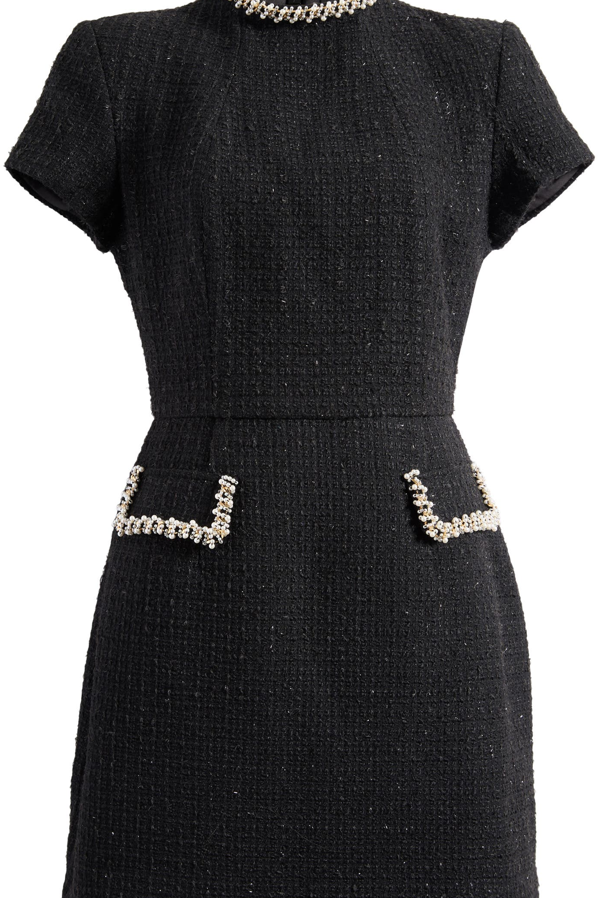 A fitted bodice with contoured seaming plays up the signature tulip-style skirt of this elegant yet playful minidress made from shimmer-streaked tweed with pearly-bead trim.