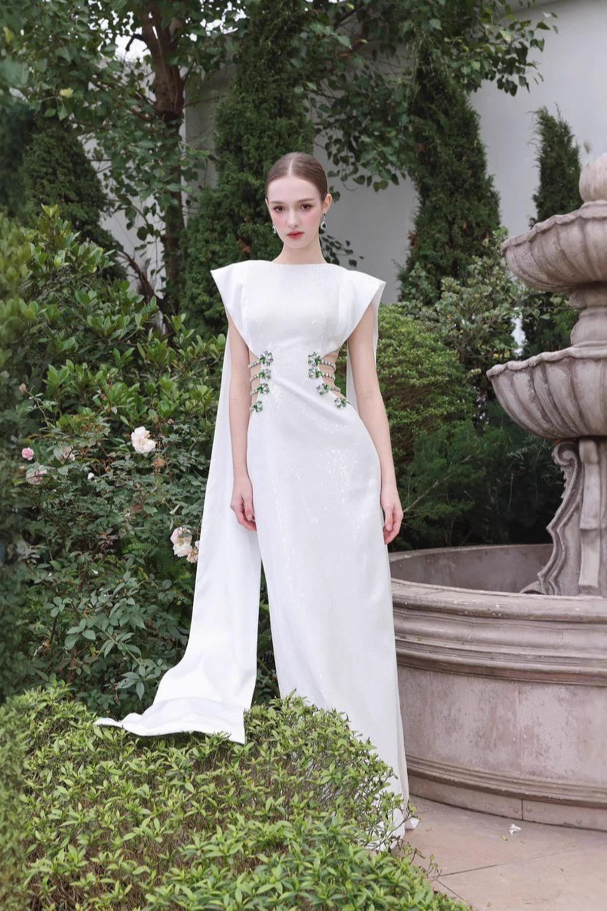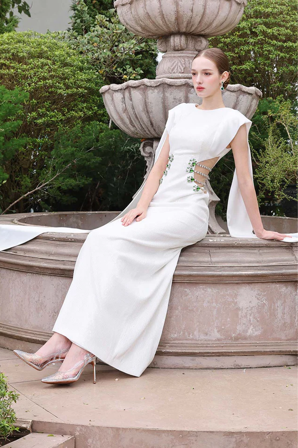 Expertly designed for maximum impact, the dress boasts a sleek and flattering sheath silhouette with a unique asymmetric flap detail. Perfect for special occasions, this dress offers both style and sophistication.