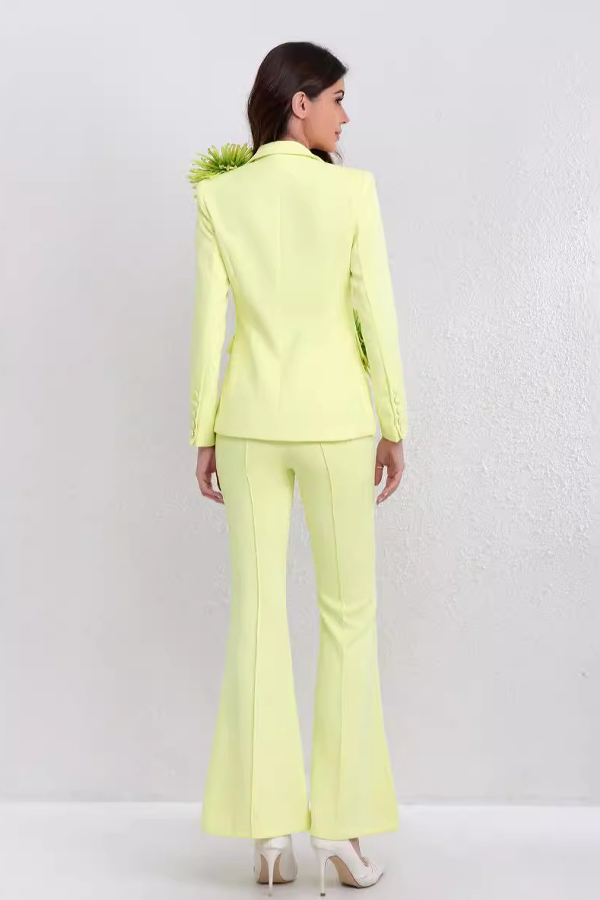 Whether you're dressing for a business meeting, a special event, or a chic day out, the Flora Flower Details Single Button Blazer & Flared Pants Set is the perfect choice. Pair it with elegant heels and understated jewelry for a refined, sophisticated style.