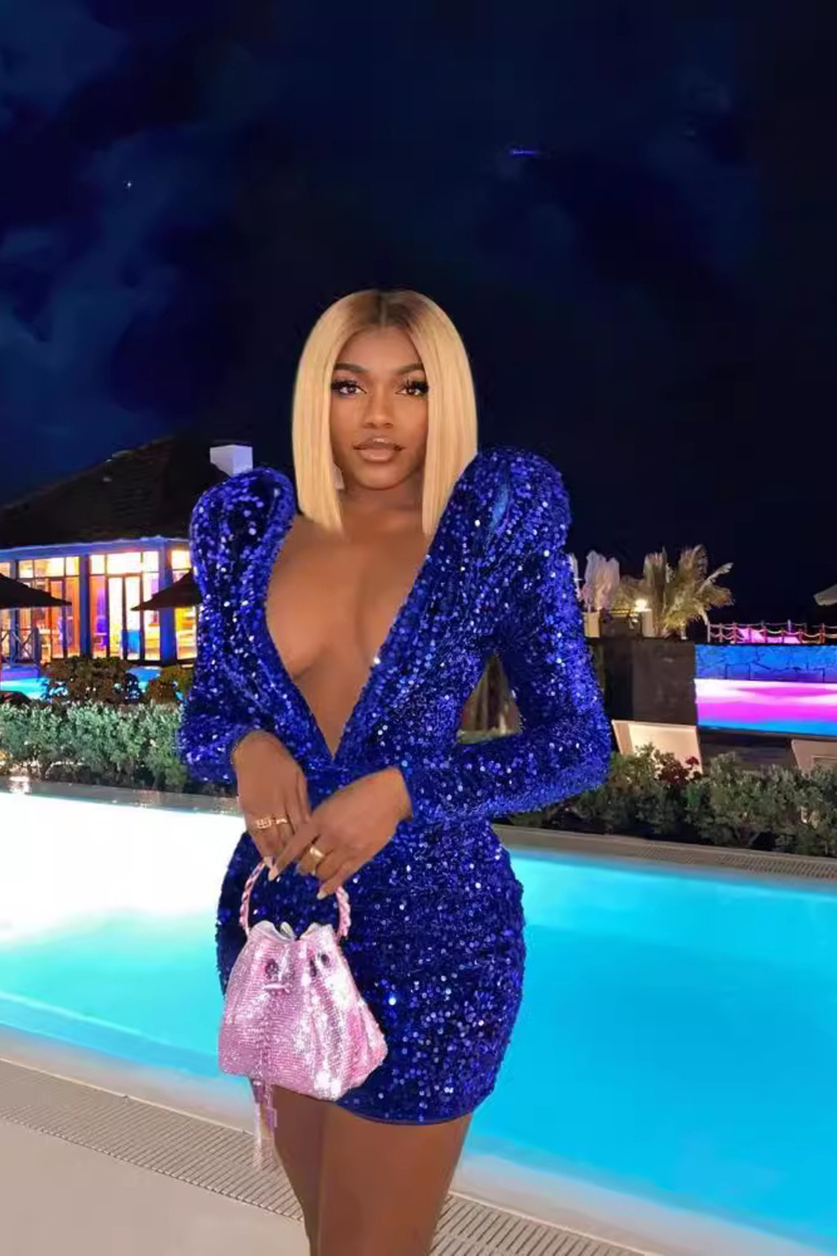 Shimmer in the spotlight with this stunning V Neck Sequined Mini Bodycon Dress. With a form-fitting silhouette and sparkling sequined embellishments, it is ideal for making a show-stopping statement. Crafted from luxurious fabric, this dress is sure to turn heads and create an unforgettable look.