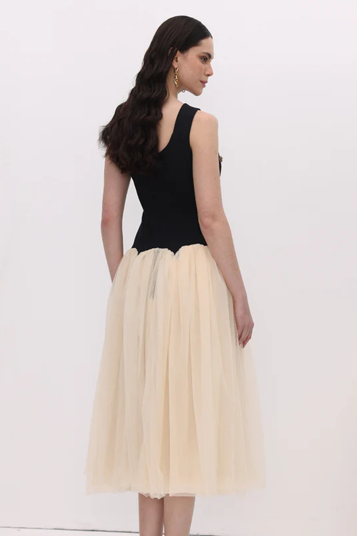 The midi dress features a corset-style top that beautifully cinches the waist, creating a strikingly structured silhouette. The scalloped edging flows into a pleated tulle mesh skirt, adding a touch of ethereal elegance. For a refined office-to-evening transition, pair this dress with sleek heels and minimal accessories.