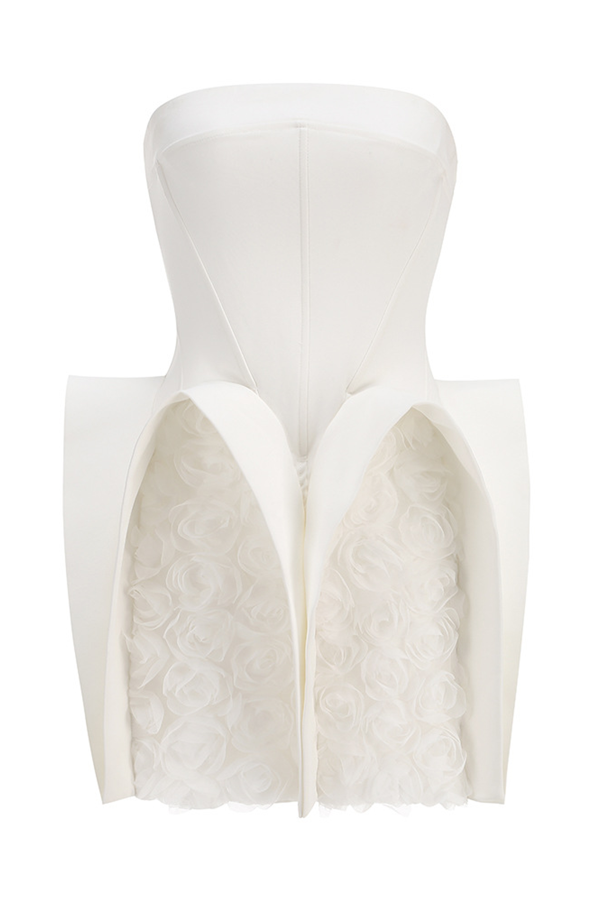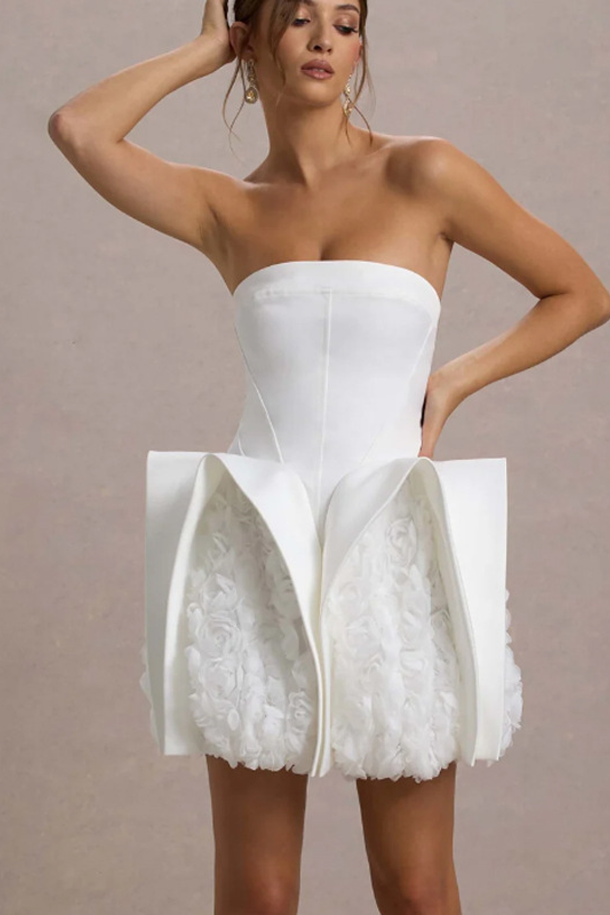 Flirt with florals this event season in our aptly-named mini dress, Orchid Oasis. Arriving in a structured silhouette of our premium crepe, this couture-like LWD boasts a bandeau neckline, boned bodice and sculptural skirt adorned with 3D floral embellishments.