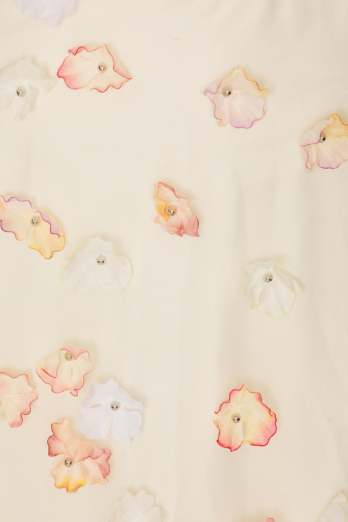 The Yellow Strapless Maxi Dress is a stunning gown that exudes elegance and femininity. Crafted from luxurious fabric, this strapless dress features a fitted bodice adorned with intricate floral appliqués in shades of pink and white, adding a romantic touch to the overall design. The A-line skirt flows gracefully down to the floor, creating a silhouette that is both timeless and sophisticated. The subtle yellow hue gives the dress a warm and cheerful vibe, making it perfect for formal events such as weddings, galas, or proms. The attention to detail in the craftsmanship ensures that every element of this dress comes together harmoniously, resulting in a piece that is truly breathtaking.